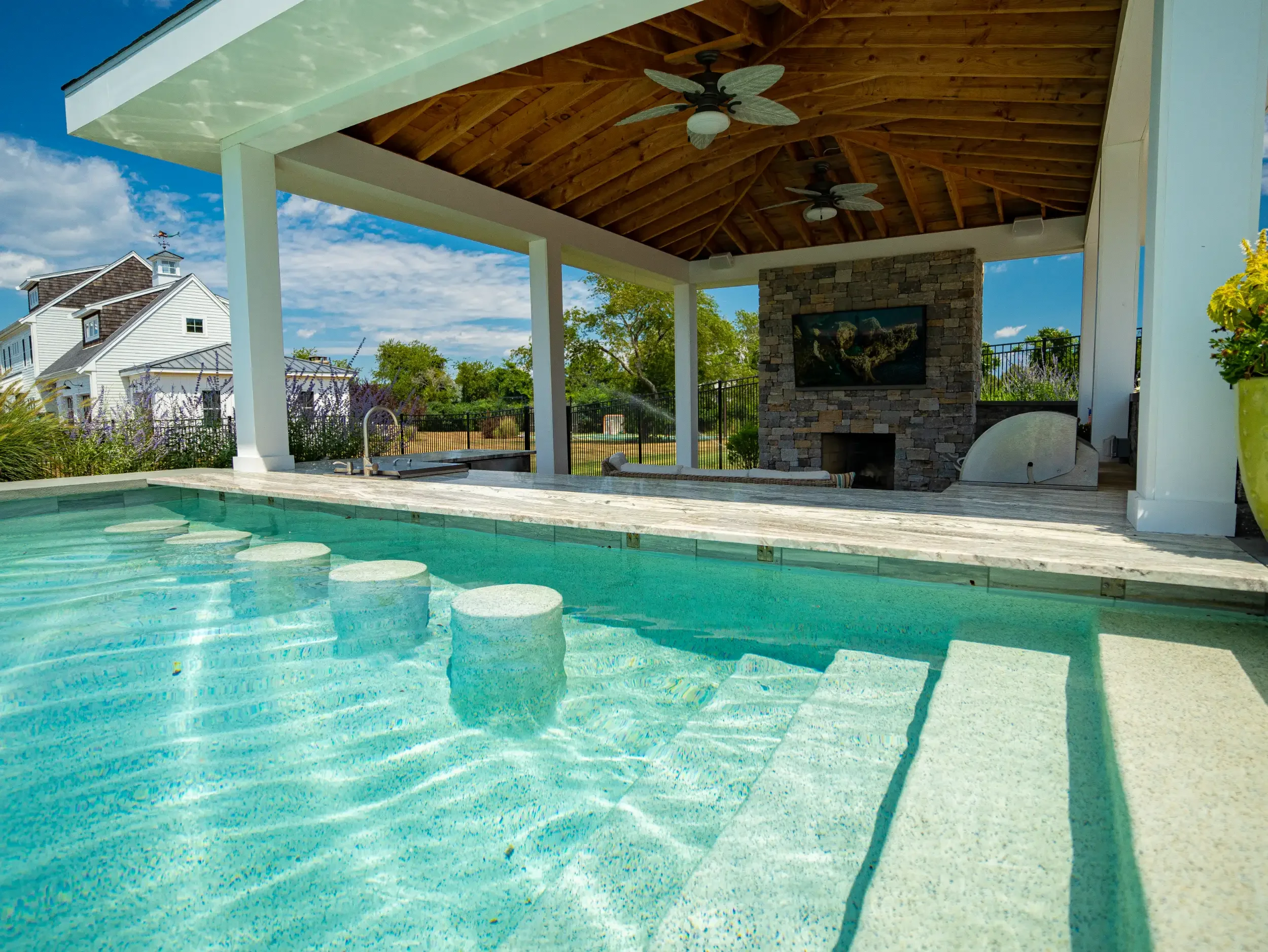 Relax beneath a solid-roofed pavilion or dappled pergola, each crafted for comfort, weather protection, and architectural impact.